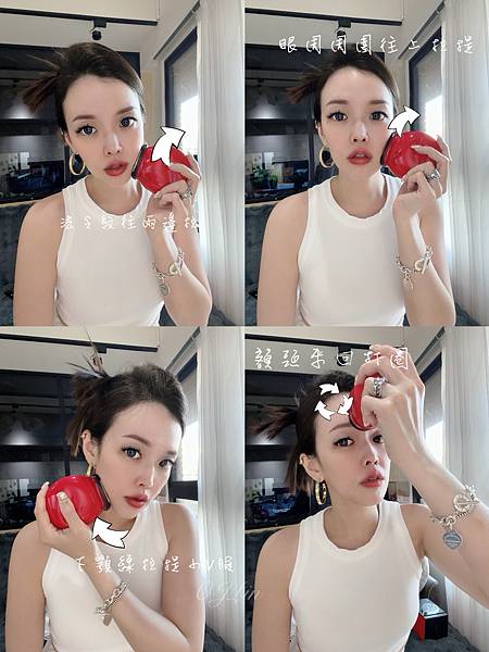 然後╭☞ 法令紋兩邊拉一下、下頜兩邊往上提一下、眼周兩邊熨一下、最後額頭打圈